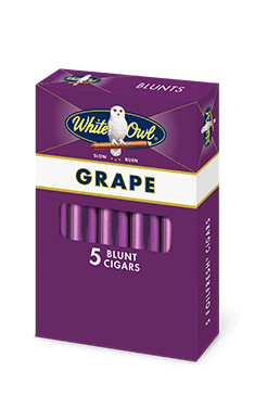 A pack of five White Grape flavor White Owl Large Blunt cigars.